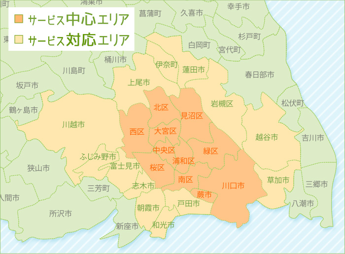 つなぎてホームサポートは、埼玉県さいたま市から車で約30分~45分圏内(